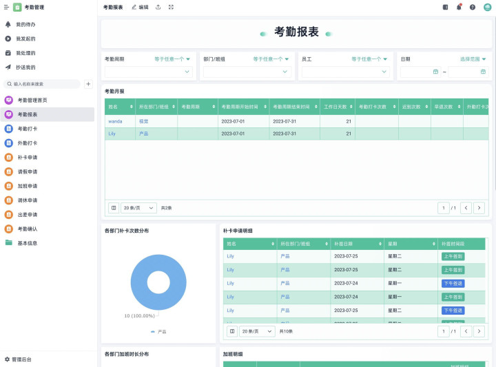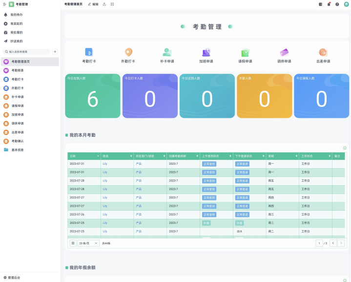 能做到这几点,才配得上“OA”这两个字。 2. 数据实:数据自动积累,能分析,能回溯 不要小看“数据一致”这件事。一个靠谱的人事系统,所有模块必须数据贯通、结构一致、可溯源。 员工信息和打卡、请假、加班记录全部自动关联; 请假明细按类型分类,自动更新年假/调休余额; 打卡数据不是“截图存档”,而是结构化字段,随时查、随时分析; 系统生成的月度报表可直接用于绩效、工资、晋升参考。