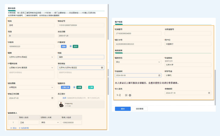 1. 员工信息登记(入职用) 入职时,员工扫码填写资料: 姓名、手机号、身份证号、性别、邮箱 所属部门、岗位、入职时间 紧急联系人、合同起止时间等